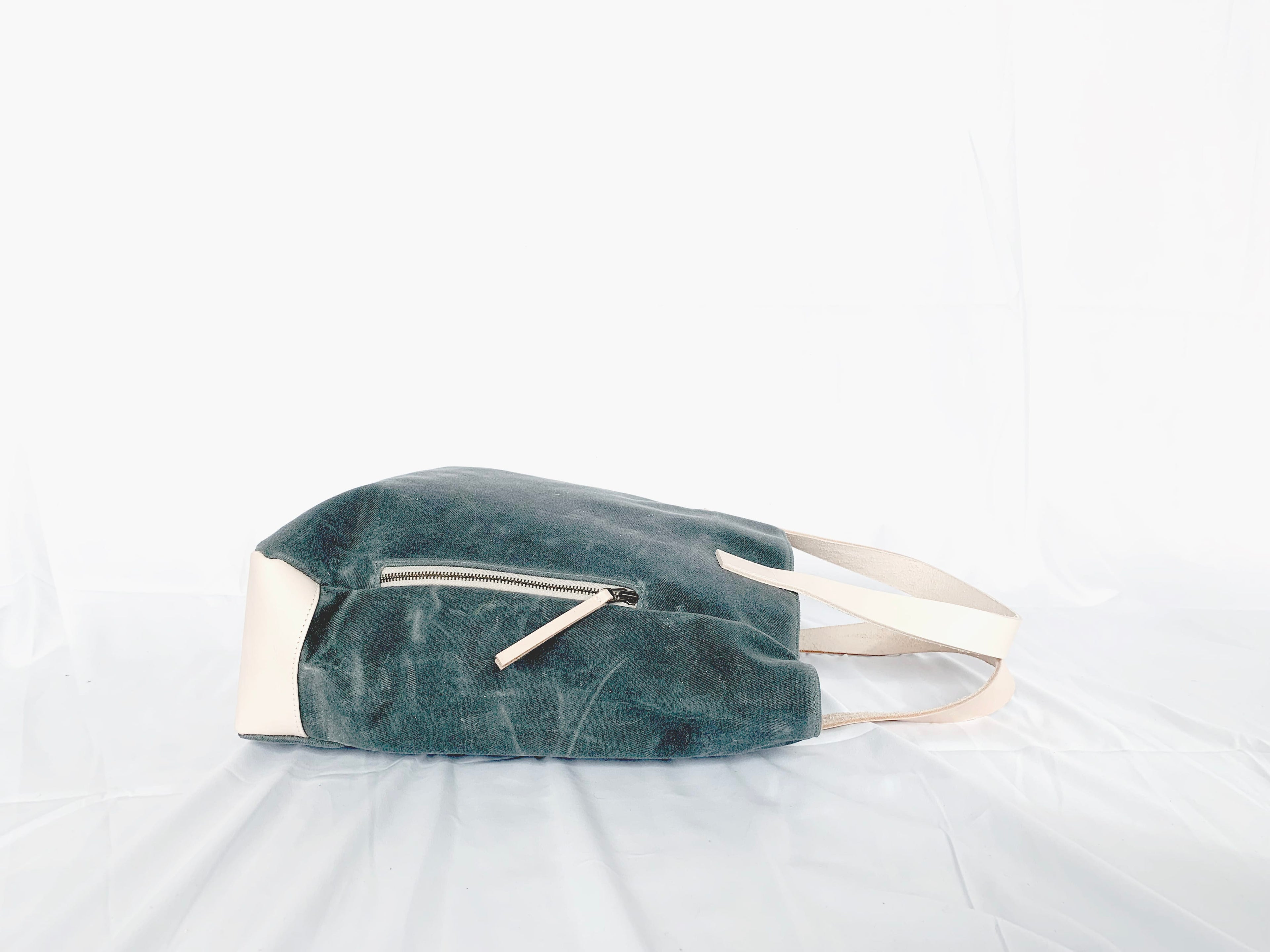 1.Notebooks & Honey bags are made of 100% cotton 18 oz. filter twill.  There is a TexWax finish, making it a durable, water resistant and weather tough wax canvas great for everyday uses and adventures. Each bag is paired with a 100% nylon taslan lining that is soft yet strong and also water resistant.  The straps are 7-8 oz vegetable tan leather and are paired with a thinner version of vegetable tan leather for the bottoms, zipper tabs and logo.  The wax canvas and vegetable tan leather are meant to have their own unique characters that will show through as the bags weather and patina and over time and use.  There is an edginess to the material choices that, paired with the design, give the bag a sophisticated yet down to earth look.Â