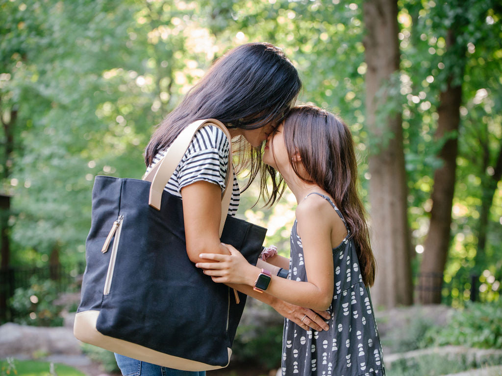 First let's back up to how the this idea first came about... Above is an old photo of my first born/ daughter, whom I call "Honey", when she was a toddler. She is now a full on kid and has two younger brothers. When I was pregnant with her and then, subsequently, with her brothers, I was desperately looking for a diaper bag that can easily transition into a laptop bag/big purse. Take the laptop out, pop in the diapers/wipes and sippy cups and off we go. I looked for hours and hours online with not luck. All the diapers bags LOOK like diaper bags; I'm not into that. I tried converting my large purses and totes into diaper bags, not really working either because the baby bottles kept tipping over and causing messy leaks and there were not enough perfect compartments. Also, what about my laptop?! I need that for work, where do I put that?! I refused to carry two bags. I'm a freelance commercial interior designer and with three little kids and being a full time chauffeur and personal assistant to them, I constantly have my laptop with me so I can find the closest coffeeshop to work out of in between school and activity pick up and drop offs. And so here we are today... hence, NOTEBOOKS & HONEY. "Notebooks" referring to laptops, tablets, agendas, planners, actual notebooks and "honey" referring to the babies, kids, adult kids and fur babies.